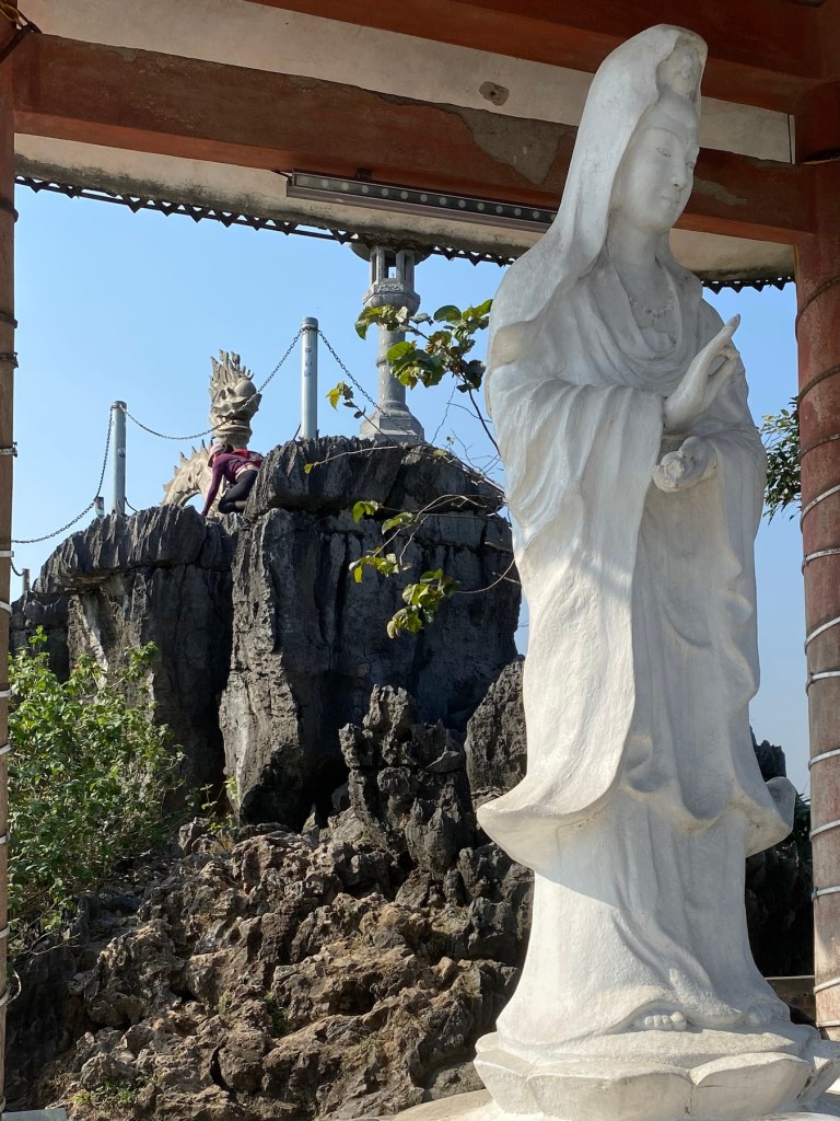 The Ma Yen Mountain has a temple at the top and the steps leading up to the top were constructed for the King in the Citadel style of the Tenth Century. It is challenging to climb the path of almost 500 unregulated hewn stone steps. Each limestone step is a different height and they manage to get progressively steeper as you reach the top. The rewarding panorama of the karst formations, the river and the surrounding villages is mystical and picturesque. Even Quan Am Bodhisattva (Lady Buddha) is smiling.