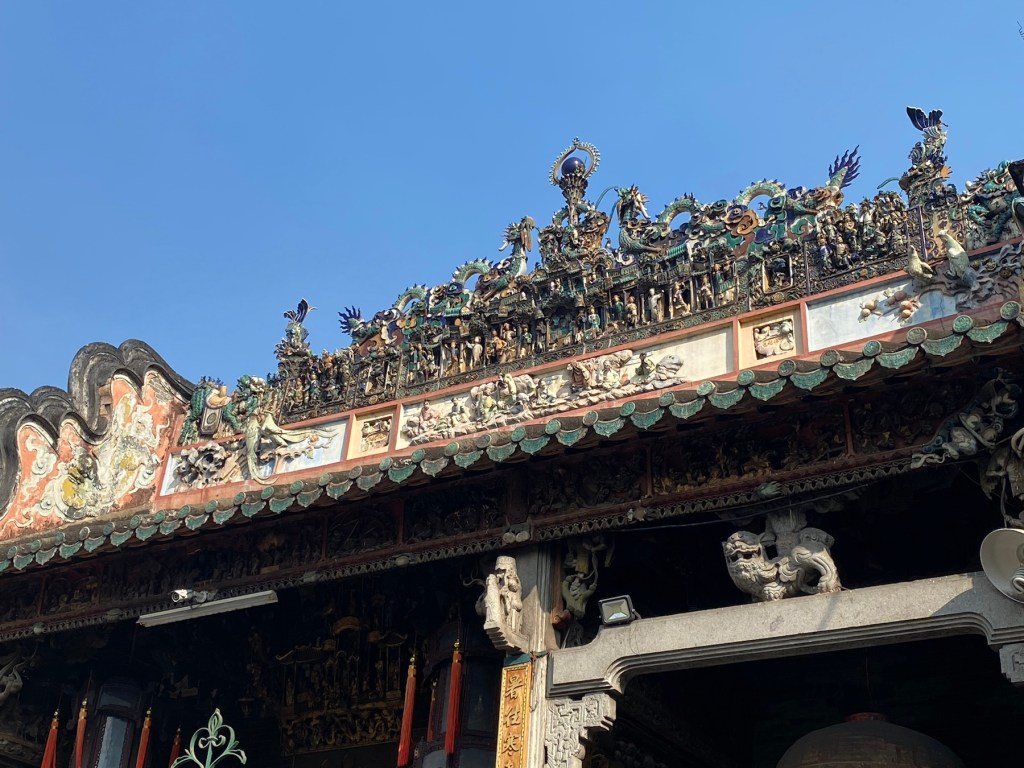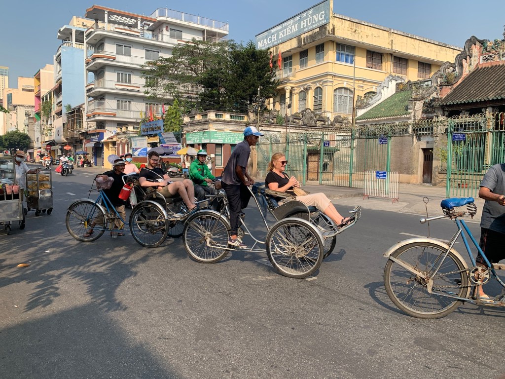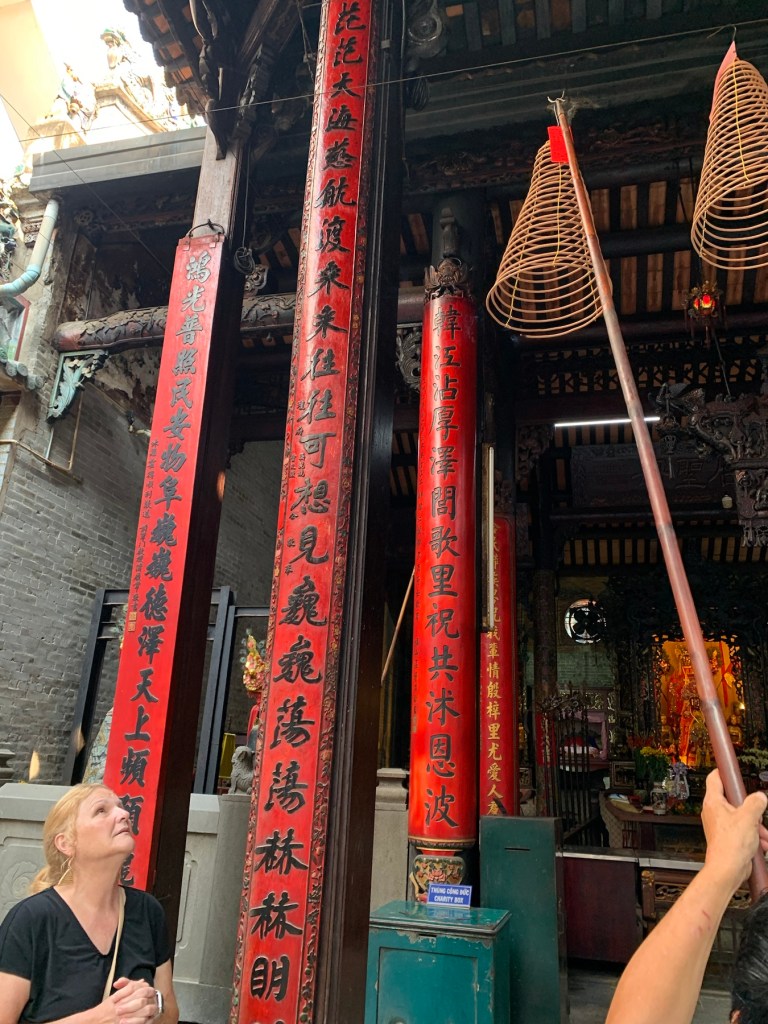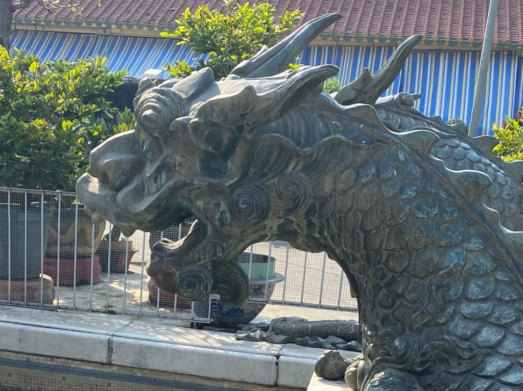 HCMC/Saigón has 24 districts; most of the tourist attractions are in District One, where the French set up government buildings and an economic center. District Five, however, is the central area of historic Saigon. Cho Lon, or Chinatown, was settled in the late 17th century by ethnic Chinese. It was known by its Cantonese name, Tai-Ngon (Embankment) which was often mistaken for the similar sound ‘Saigon’. It is now dubbed Cholon (Big Market). If you believe the internet, it is the largest Chinatown in the world. We took a tour which began at the Tue Thanh Assembly Hall, which was built in the late 1700s and served many purposes including immigration management and worship hall. A donation gave us the opportunity to make a wish and light some incense which will burn for a week. Following the temple, the tour included a tuk tuk ride to a wholesale market. We walked through stalls filled with everything from hats and shoes to dried fish, all with huge minimum purchases. There is a fountain at the back of the market with a half dragon-half alligator sea monster. There is a fear that this creature lives in the river. All the boats in the river have eyes painted on them to frighten the monsters. No swimming please.