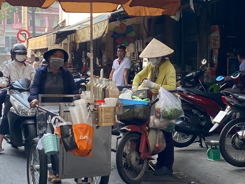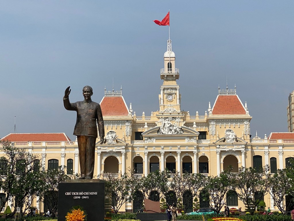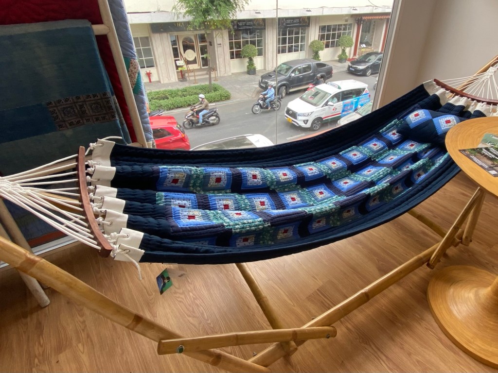 Back in the city we walked past the remarkable People’s Committee of Ho Chi Minh City or Ho Chi Minh City Hall. This French Colonial building is beautiful and takes up a full city block. It’s not open to the public but it is a nice photo opportunity. Close to this is the Cafe Apartments building. This unusual building was constructed in the 1960s and served as housing for government and military personnel during the Vietnam War. It was later abandoned and converted into individual apartment cafes or businesses. Inside you can take the stairs or the elevator to each floor and check out the residential building layout that’s an atypical use for commerce. We took in the view from a cafe on the 8th floor and sipped a local Vietnamese iced mocha coffee. On the walk back to our hotel we came across a quilt shop! What a surprise. There are no fabrics for sale (phew!). Every item is hand quilted. The bon-profit organization Mekong Quilts has helped many women artisans across the Mekong Delta and in some indigenous regions outside of Hanoi and in Cambodia maintain financial stability with jobs that are unaffected by weather.