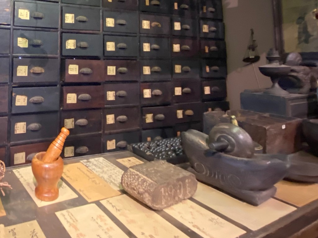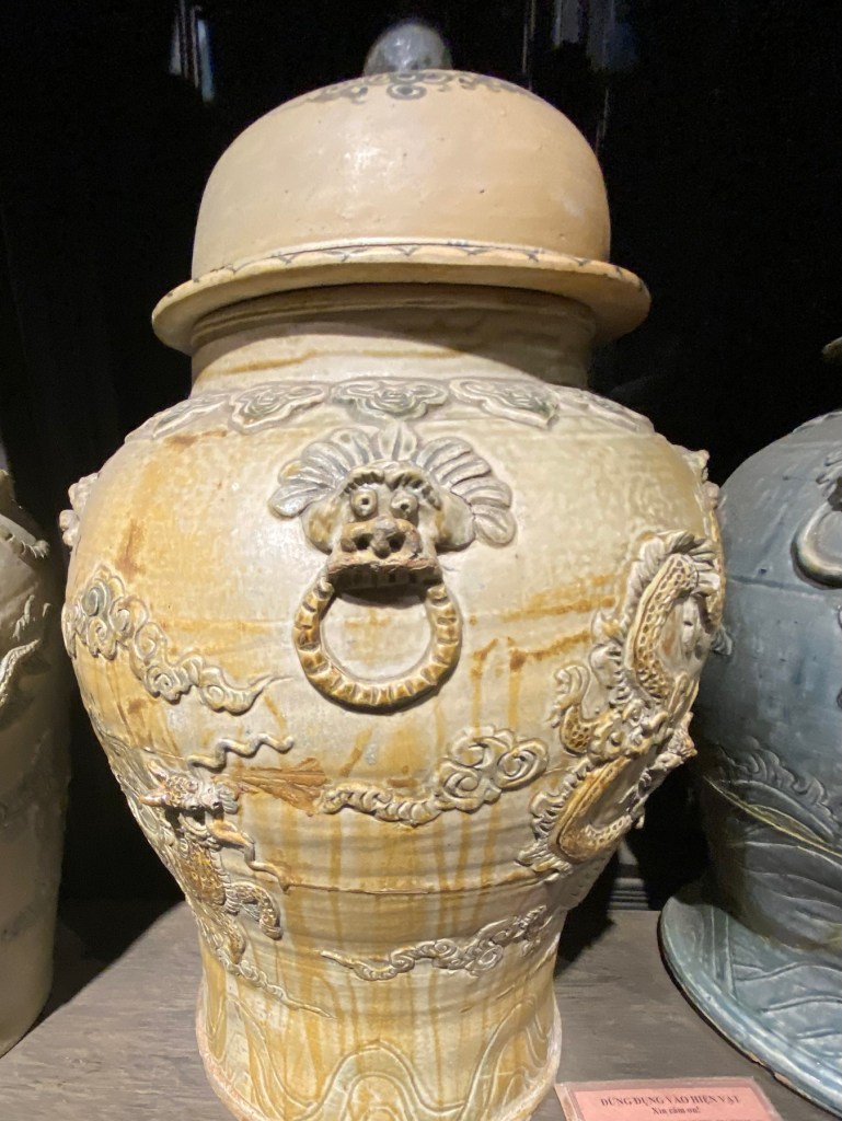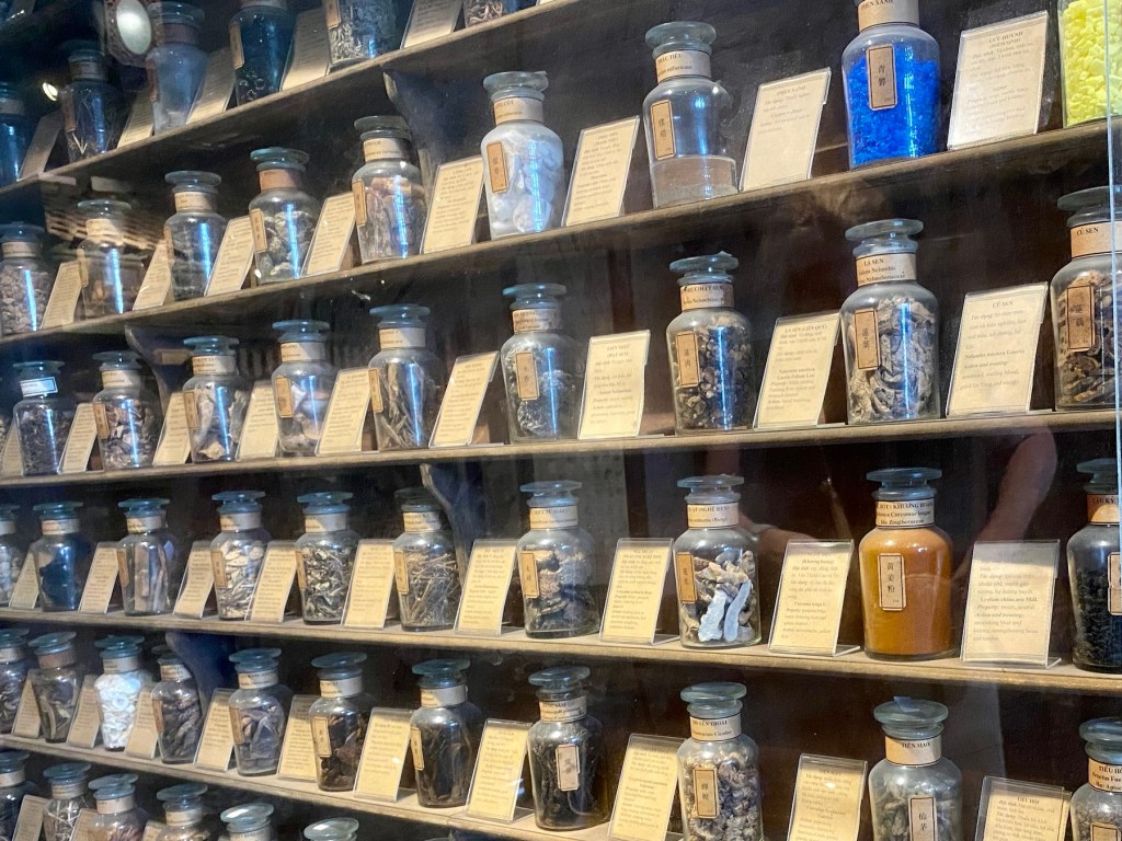 Keeping with our Chinatown experience, our next stop was the Museum of Traditional Medicine, a unique building. A former pharmacist built the home and office-turned museum using wood from old homes across Vietnam. The exhibits share insight into the history of non-Western medicine in Vietnam and the variety of different plants and herbs people used and still use today to cure a variety of illnesses and ailments. There is also a replica of an herb shop and many types of teapots and jars for boiling and storing herbs. Another floor has a large collection of mortar and pestles for preparation of the drugs. It is a beautiful location and is the back drop for lucky new year (Tet) photos to be taken in traditional dress for an auspicious new year.