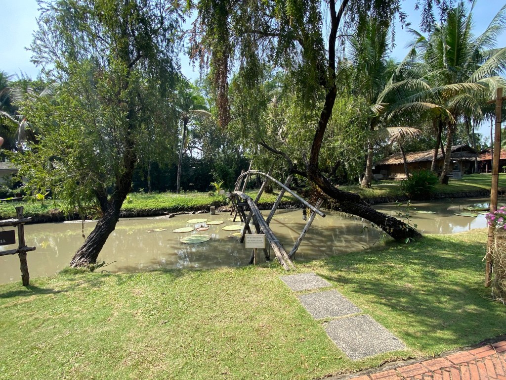 For a rural respite, we left Chinatown and went to Binh Quoi. This green space along the Saigon River is a replica village of what life was like on the Mekong Delta pre-Industrial Revolution. There are gardens, coconut palms, lakes stocked with elephant ear fish and giant water lilies. No cars or motor bikes in sight. We enjoyed people watching while sipping refreshing beverages.