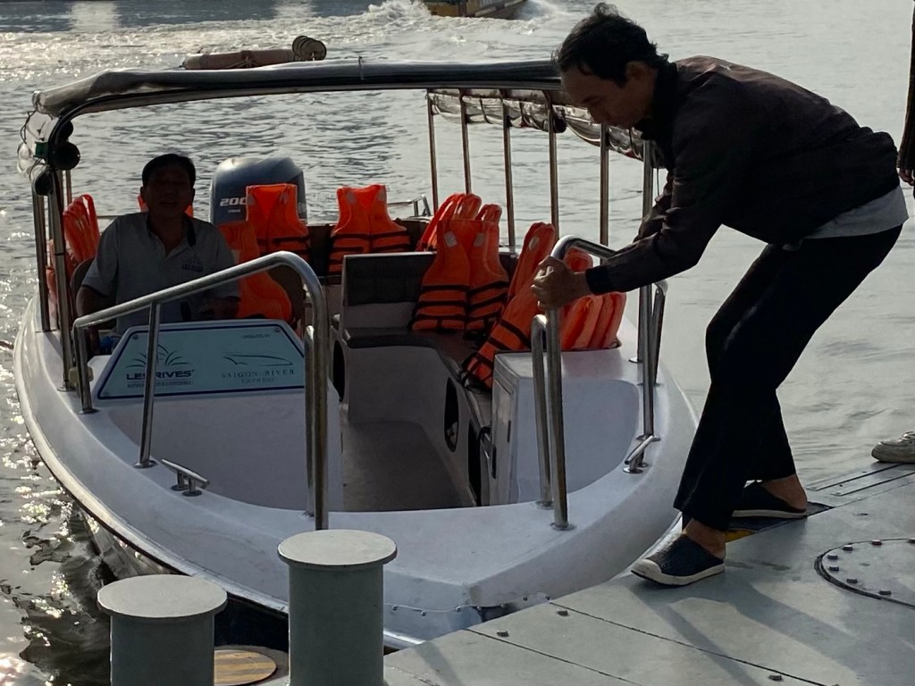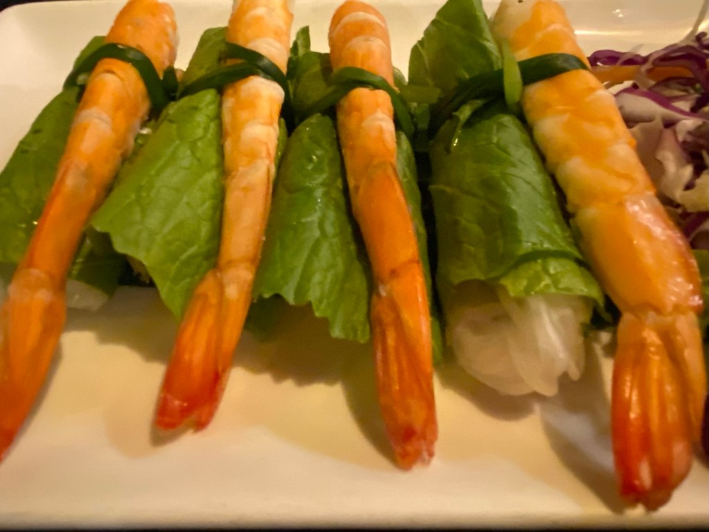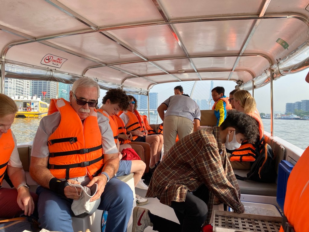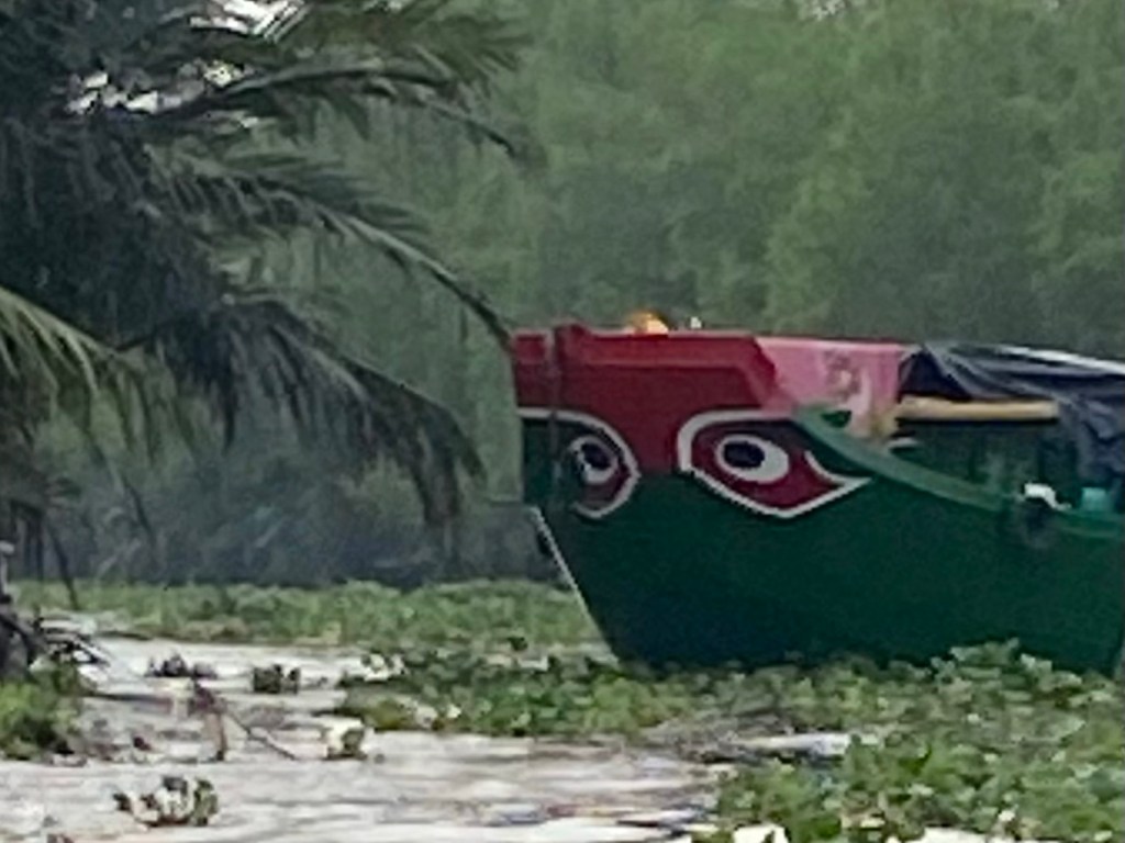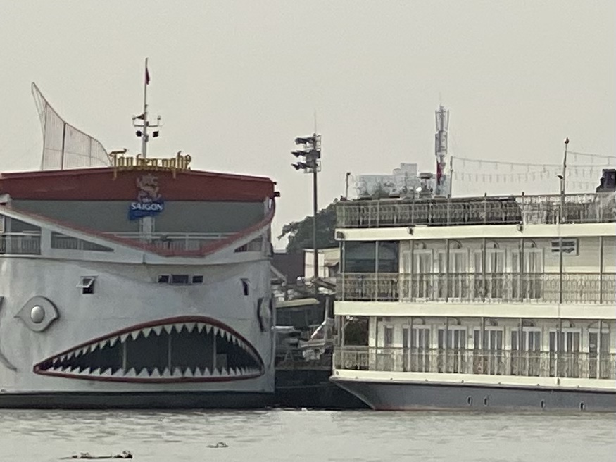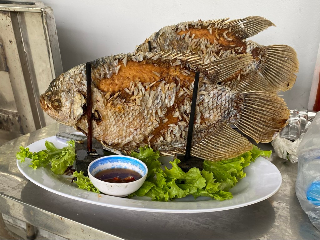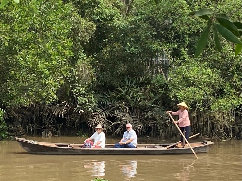 We were brought to a local restaurant by sampans where we were served shrimp and rice rolls and Elephant Ear Fish plus other local foods which were all outstanding. This was followed with shots of banana and honey whiskey—cheers!