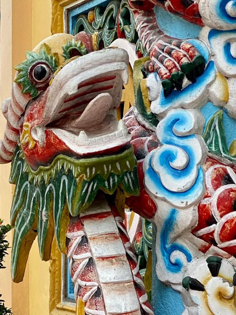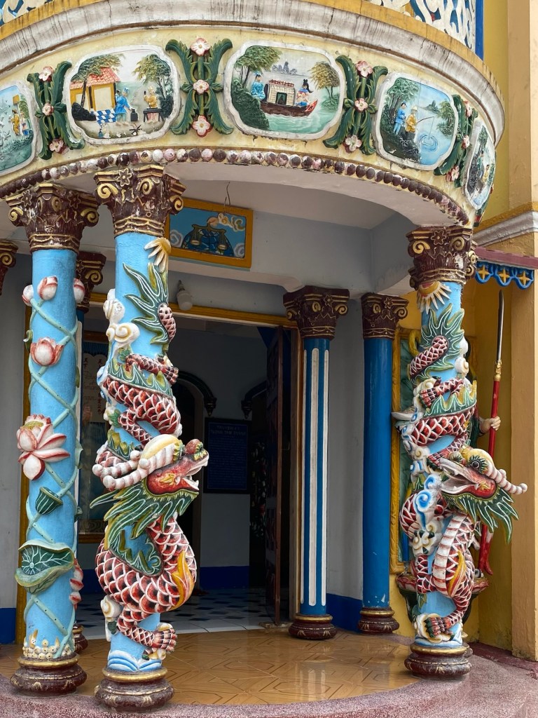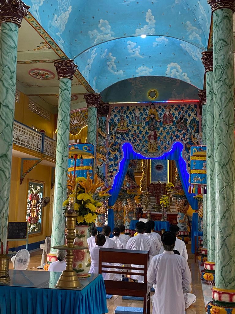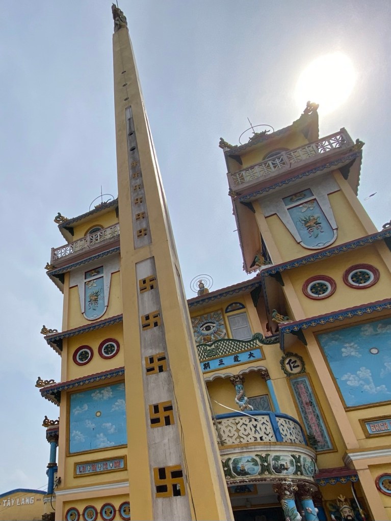 Outside of the market was a Cao Dai temple. This religion combines beliefs from Taoism, Buddhism and Confucianism. We arrived at the temple as some chanting began. It was very special.