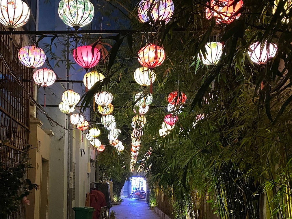 We enjoyed a Gregorian-calendar (December 31) New Year’s Eve dinner at a traditional Hue Vietnamese restaurant, Nha Hang Tib. For reference, Vietnam was first unified in 1802. Hue was not only the political but also the cultural and religious center under the royal Nguyen Dynasty, from 1802 to 1945. Lanterns lit the way to a royally delicious meal.