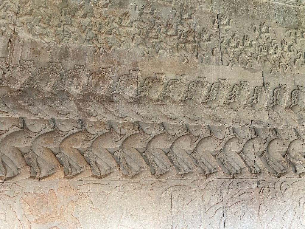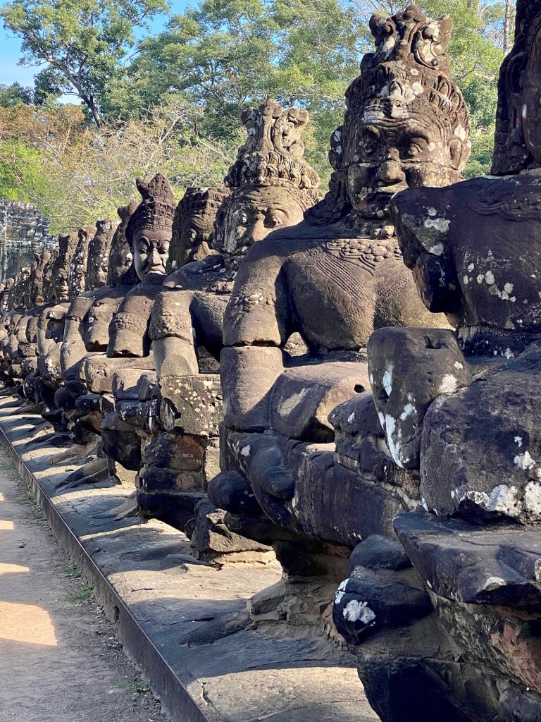 We moved from Angkor Wat to Angkor Thom, the last and most enduring capital city of the Khmer Empire. It was established in the late twelfth century. A bridge spans the moat in front of each entrance (N-E-S-W). These have a row of gods on the left and demons on the right, each row holding a naga (snake) in the position of a tug-of-war. This appears to be a reference to an ancient myth of the churning of the sea. We entered in the south, the best preserved gate.and made our way to the Bayon Temple.