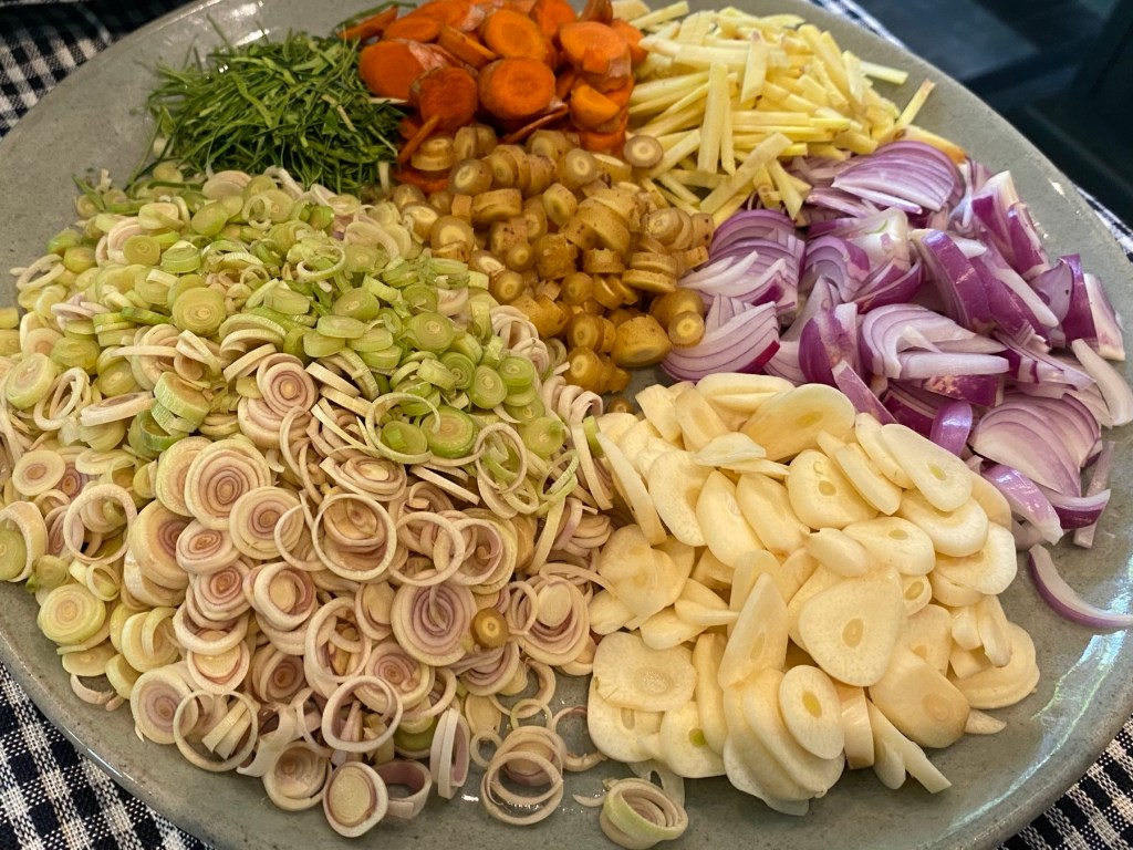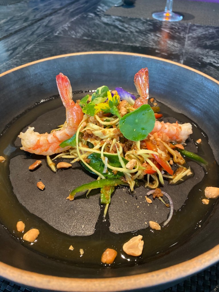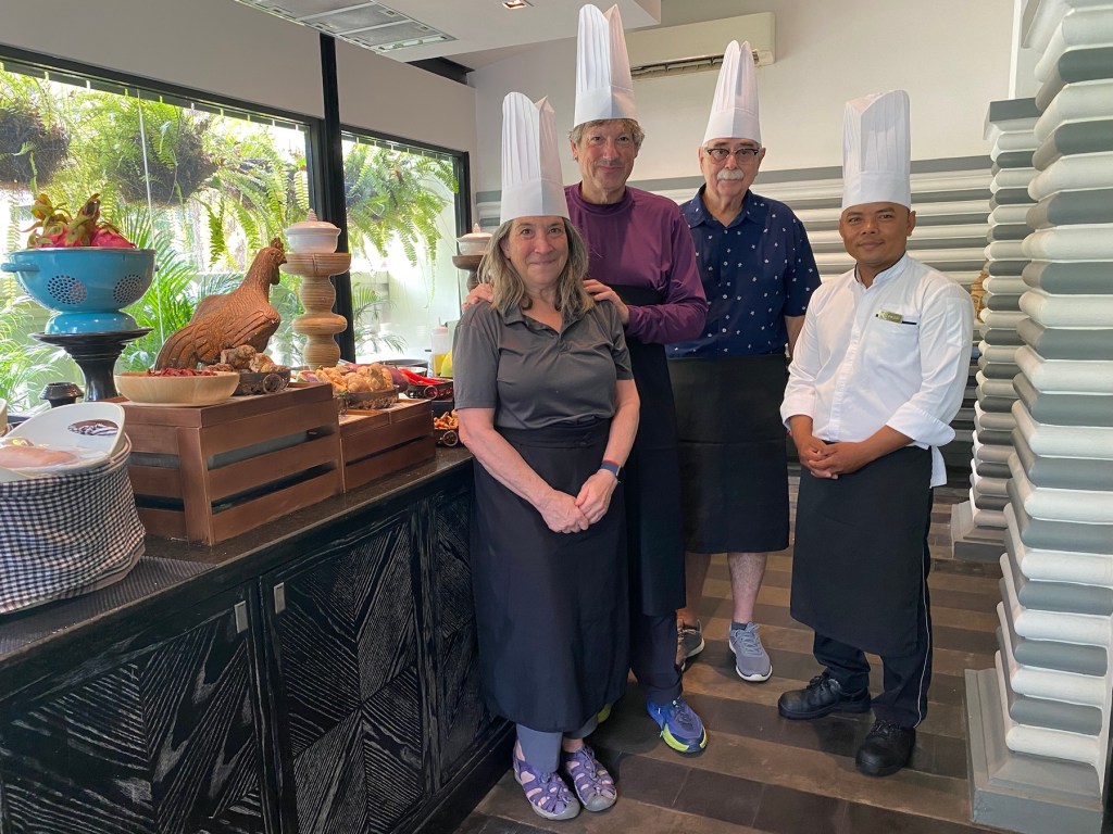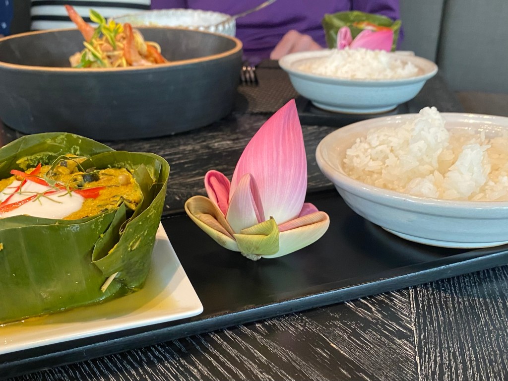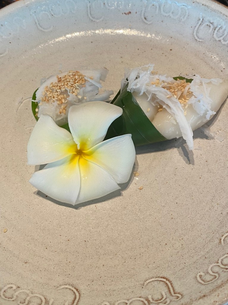 We prepared a gourmet Khmer lunch which included a green mango salad with shrimp, sweet and sour soup with beef, fish amok in a banana leaf basket and sweet rice dumplings with palm sugar and sesame seeds for dessert. We sampled fresh herbs and vegetables from the market along with very local snakehead fish in the Fish Amok we made. Our chef had us use the traditional method of combining ingredients with a mortar and pestle. We quickly switched to the more modern blender. Our meal was plated with edible flowers and it tasted as good as it looked. A chef-kiss to Cambodia and it’s delicious cuisine.