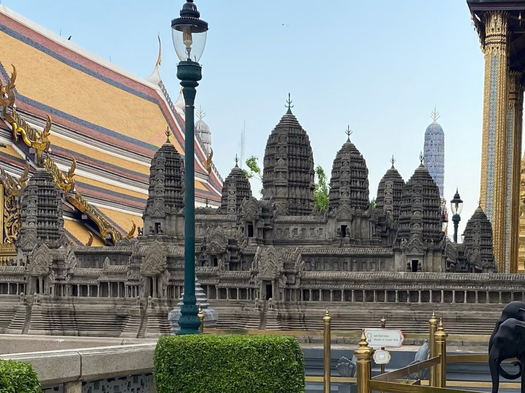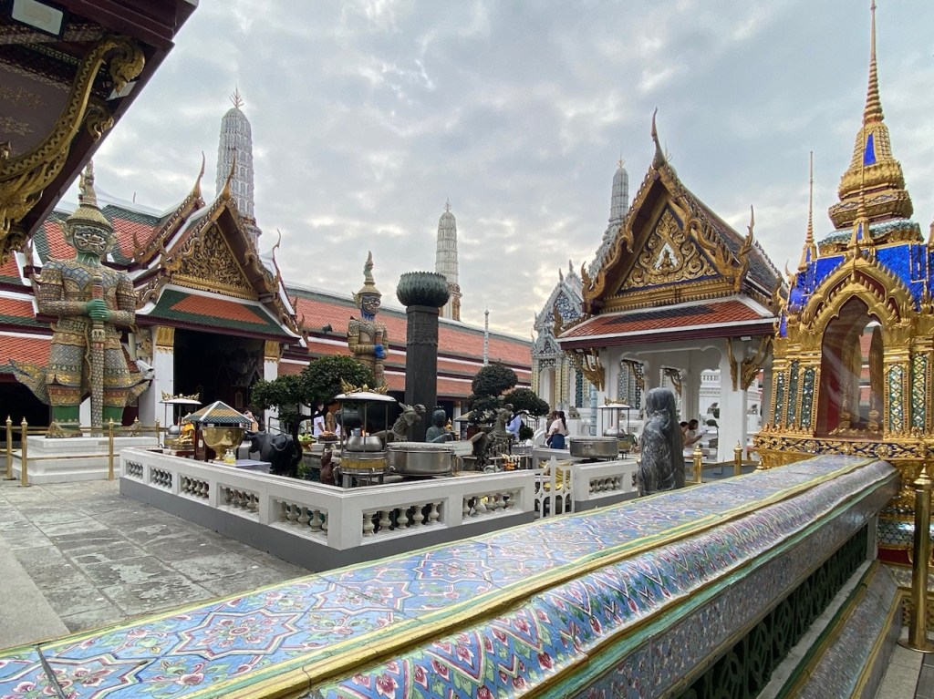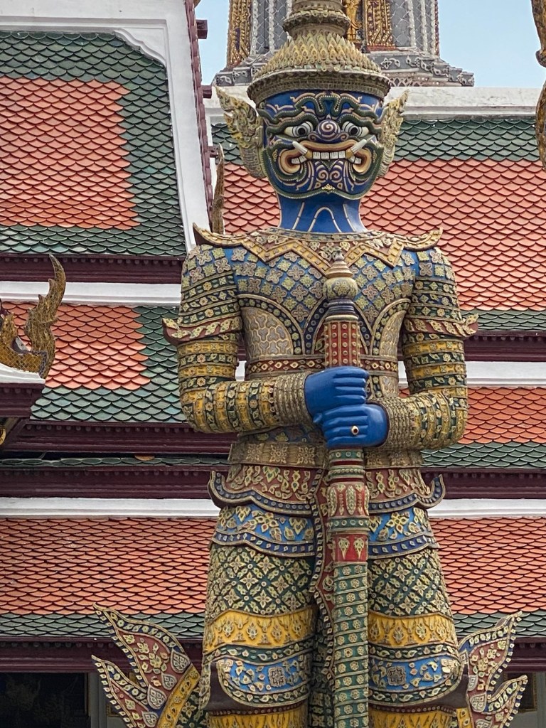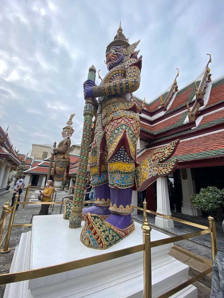 There are murals depicting mythical battles, ceramic and mother of pearl steps, gold mosaic encrusted towers, a replica of Angkor Wat and six pairs of demonic guards keeping an eye out so no harm will come to the Emerald Buddha.