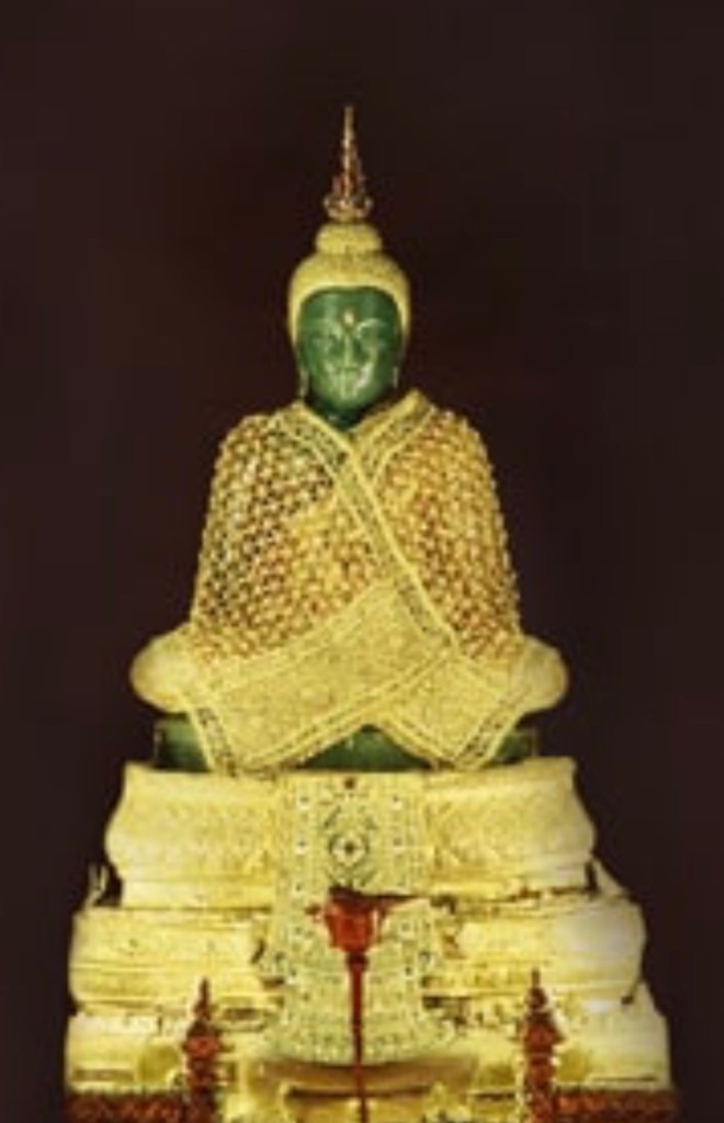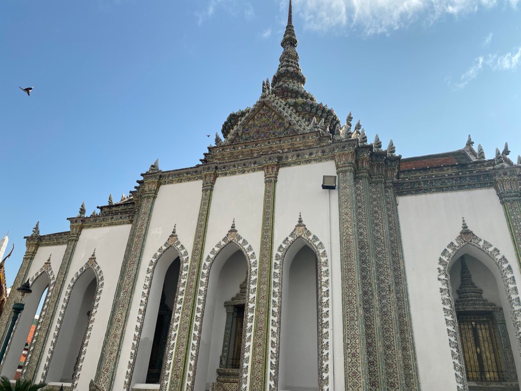 One of the most important structures at the Grand Palace is Wat Phra Kaew or the Temple of the Emerald Buddha. It houses the famed Emerald Buddha and is considered the most sacred Buddhist temple in Thailand. The unique aspect of the royal temple in the palace is that it has no living quarters for Buddhist monks. The outside walls of the building are decorated with gilt and colored glass mosaics. The Emerald Buddha is carved from a block of jasper and is about two feet tall. He is in a meditation pose. There are three different outfits made of gold which are changed during a special ceremony at the beginning of summer, rainy season and winter.