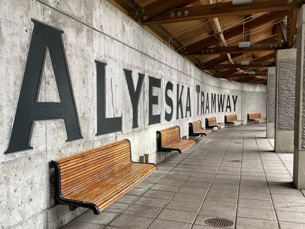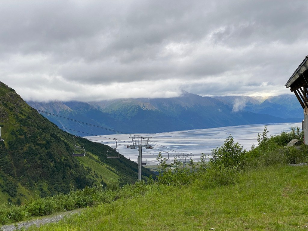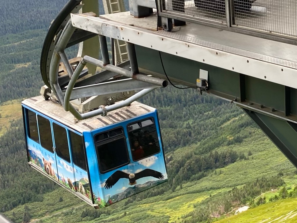 We took a very short hike through the dense forest to Virgin Falls. Then a tram ride to the top of Mount Alyeska for a panoramic view of Cook Inlet, six glaciers and the beautiful village below. Just breathtaking. We even saw some daredevil bike riders head down the mountain.