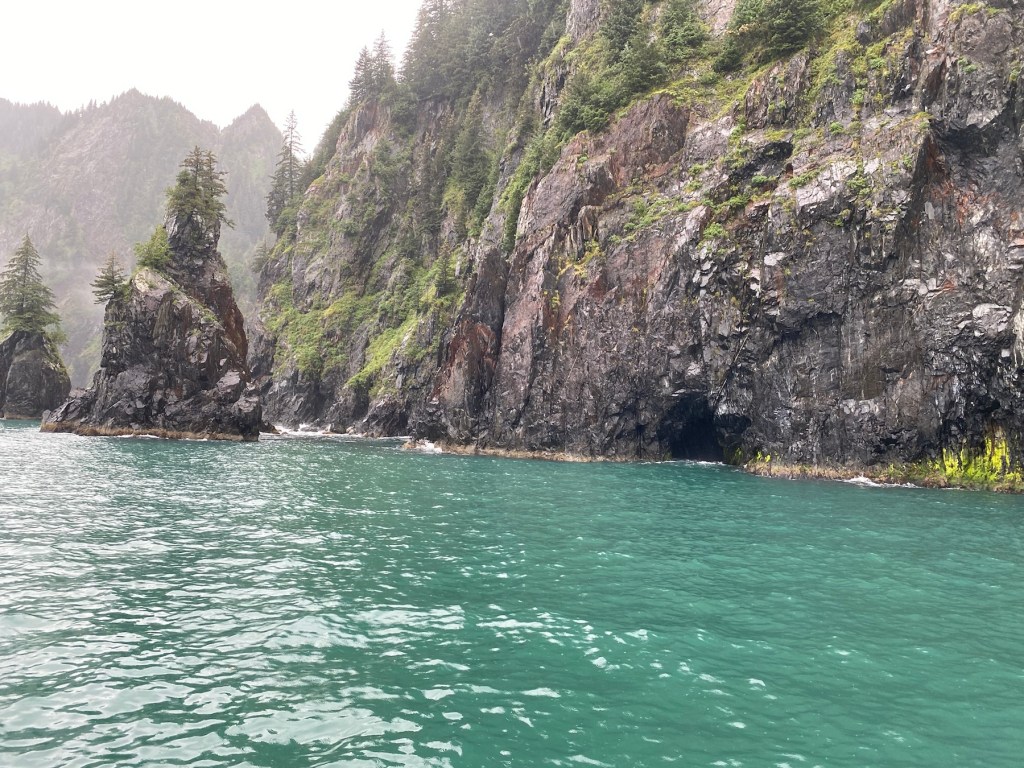 Seward is a small town on the Kenai Peninsula with a giant harbor on Resurrection Bay. This area was formed by shifting glaciers from the Ice Age thousands of years ago and as recently as the giant earthquake of 1964. The Atlantic and Pacific tectonic plates shifted creating several fjords and bays. There are tidal glaciers, forests filled with Sitka spruce trees and amazing wildlife that make up a coastal temperate rainforest where the annual temperature is between 39F and 54F. The scenery is majestic, awe inspiring and hard to capture with a photo or even words. The annual rainfall is approximately 700 inches per year and, yes, we experienced lots and lots of rain.