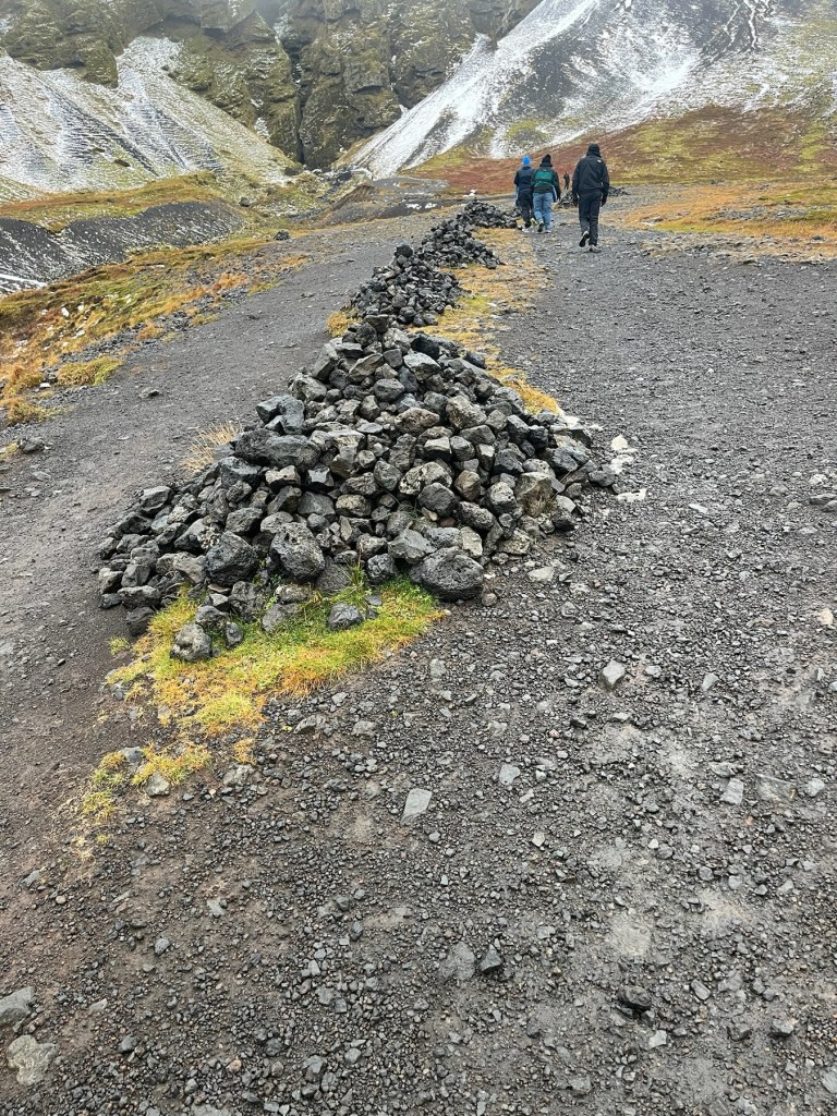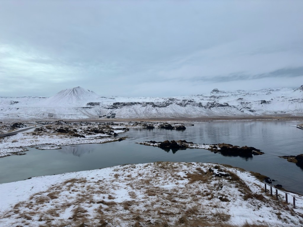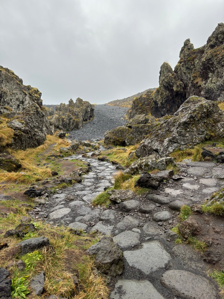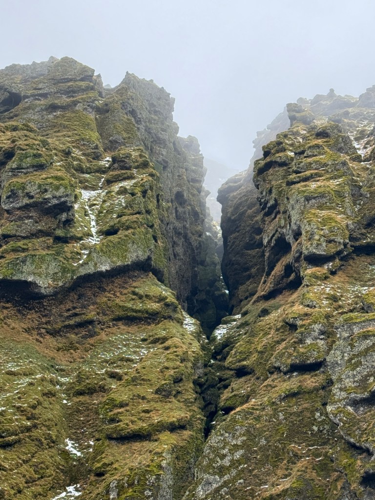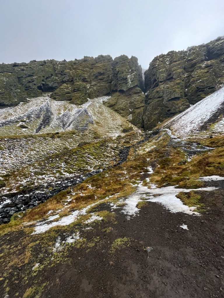Our first stop was the Raudfeldsgja Gorge. From the road and even from the parking area, it just looked like a crack in the lava mountain. However, after about a ten minute walk up the sloped, stony and very slick mountain (due to the recent snow and cold temperatures) there is a babbling stream with big stepping stones to the gorge entrance. Once inside, the gorge is cathedral like and it continues on to a place where you can climb up to a waterfall. There is an Icelandic Saga which tells a tale of a half man, half troll Barour Snafellsas, He was angered by his two nephews and after taking care of both of them, he went mad and now lives in “a cave”, we did not stick around to see if it was this cave!