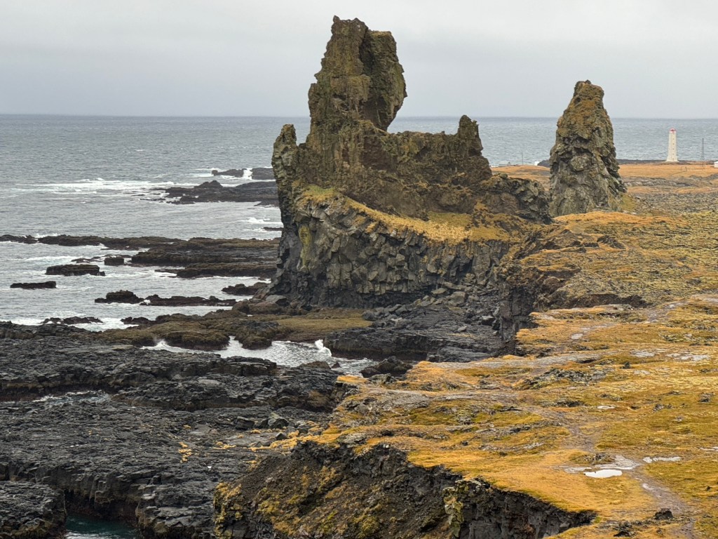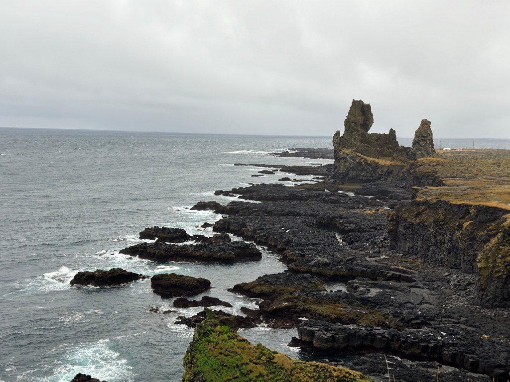 Continuing around the peninsula we stopped to see the rock pillars at Londrangar. The stunning remains of a volcanic crater, the pair of volcanic basalt rock plugs that have been formed from erosion.