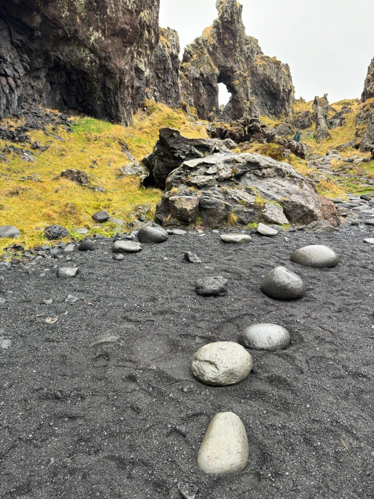 Fortified with a delicious lunch, our next beach stop was filled with shiny black pebbles that shimmered like black pearls. Djupalonssandur has wreckage from a stranded ship on the shore. Our guide let us know that most of it has been taken away by scavengers. We were told it is very meditative and relaxing to lay on the stones at this beach, so we did…and it was.
