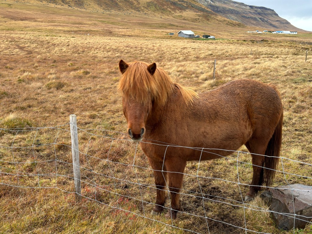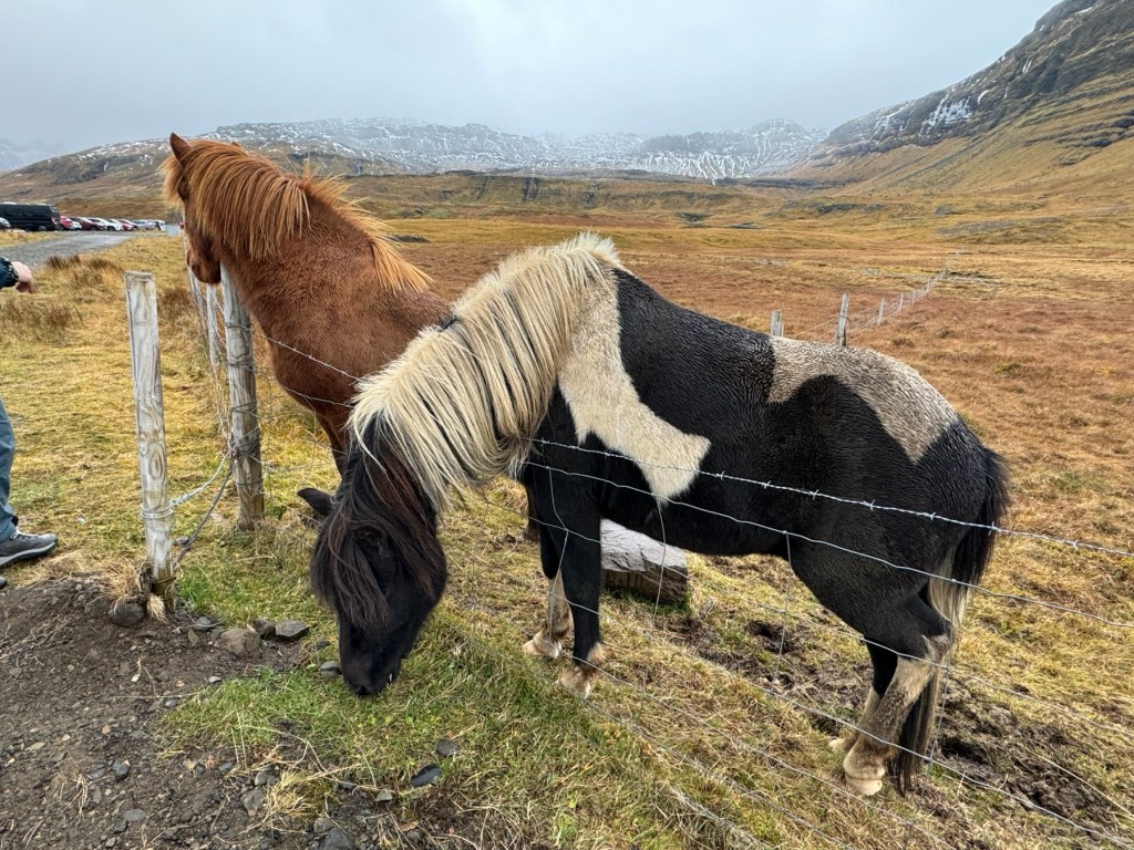 As we approached Kirkjufell mountain, it did not appear to be of daunting height or even beautiful. However, as we got closer it proved to be incredibly steep. There is a “money shot” of the mountain from across the road and at a low level. Here, there are lovely waterfalls and the Mountain view from Game of Thrones and many an instagram post. As we were returning to the car, the adjacent farms horses seemed intrigued with us. This time we were able to have an up close and personal interaction with the sweet Icelandic horses.