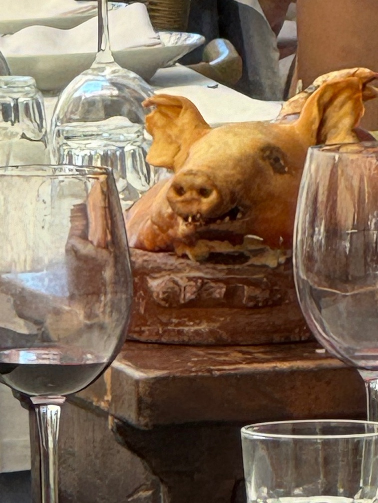 Along with historic sites, food plays an important part in our travels. Segovia has two dishes they are known for. Cochinillo is baby suckling pig. It is prepared in a way that the tender meat is served using a flat plate (as a knife). It’s found only in Segovia. We watched it getting served, zero interest in getting our own!