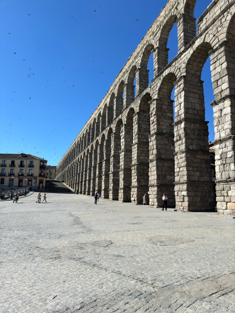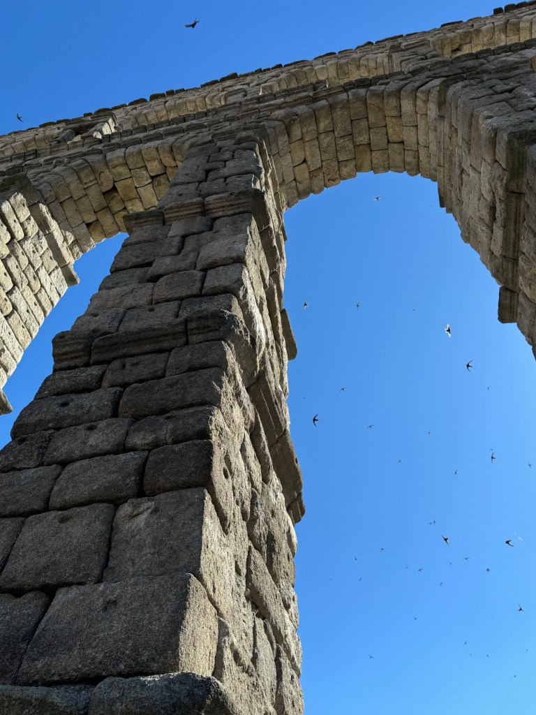Not far from Madrid are several small towns that have well preserved historic sites. Segovia is roughly an hour drive north of the capital and the city greets you with its impressive Roman Aqueduct which has become the symbol of the city. Roughly 2,950 feet long and at its highest point almost 94 ft. tall, the aqueduct is made up of 167 arches supported by pillars. Its 25,000 granite blocks are held together by balancing forces. The aqueduct was built in the 1st century and amazingly, this water delivery system was used by the city until 1973. The most bizarre site (to me) is the thousands of small sparrow-like birds that swirl around the arches in a frenetic noise.