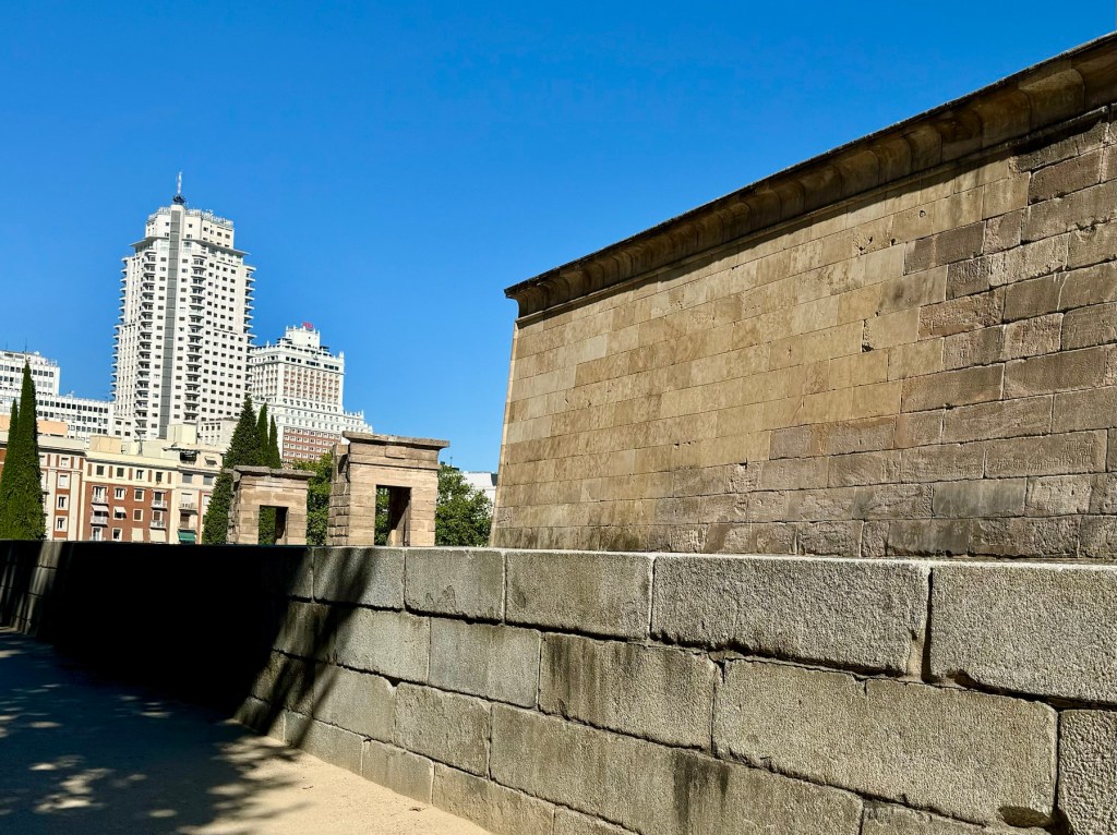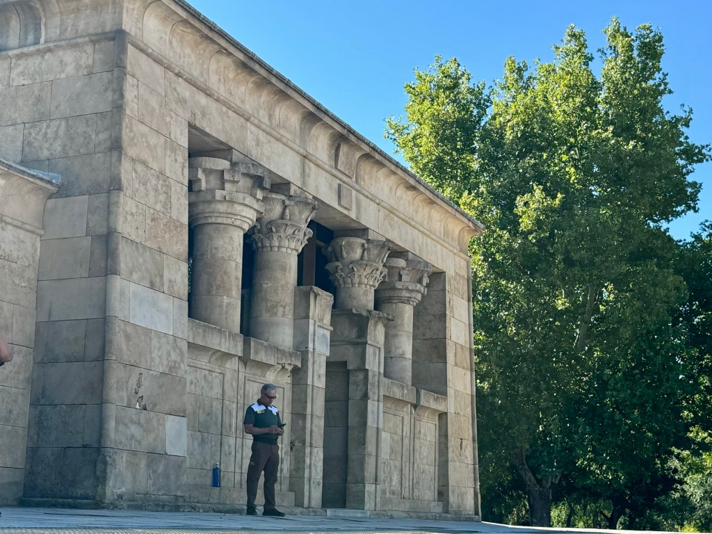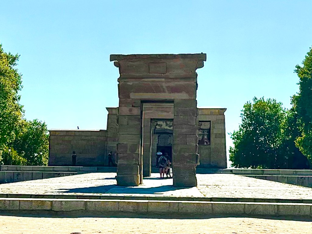 On our return to Madrid we went to the Parque del Oeste (West Park) where we visited the Temple of Debod. This ancient Egyptian temple is bizarrely out of place near the Plaza de España. It was a gift from Egypt to Spain in 1968 in thanks for Spain’s contributions to saving historic sites that would have been flooded when the Aswan Dam was completed. The temple was dismantled stone by stone and transferred to Madrid. It is striking by day and famously magnificent at sunset. Though we were there at 9:00pm, we were not even close to sunset.