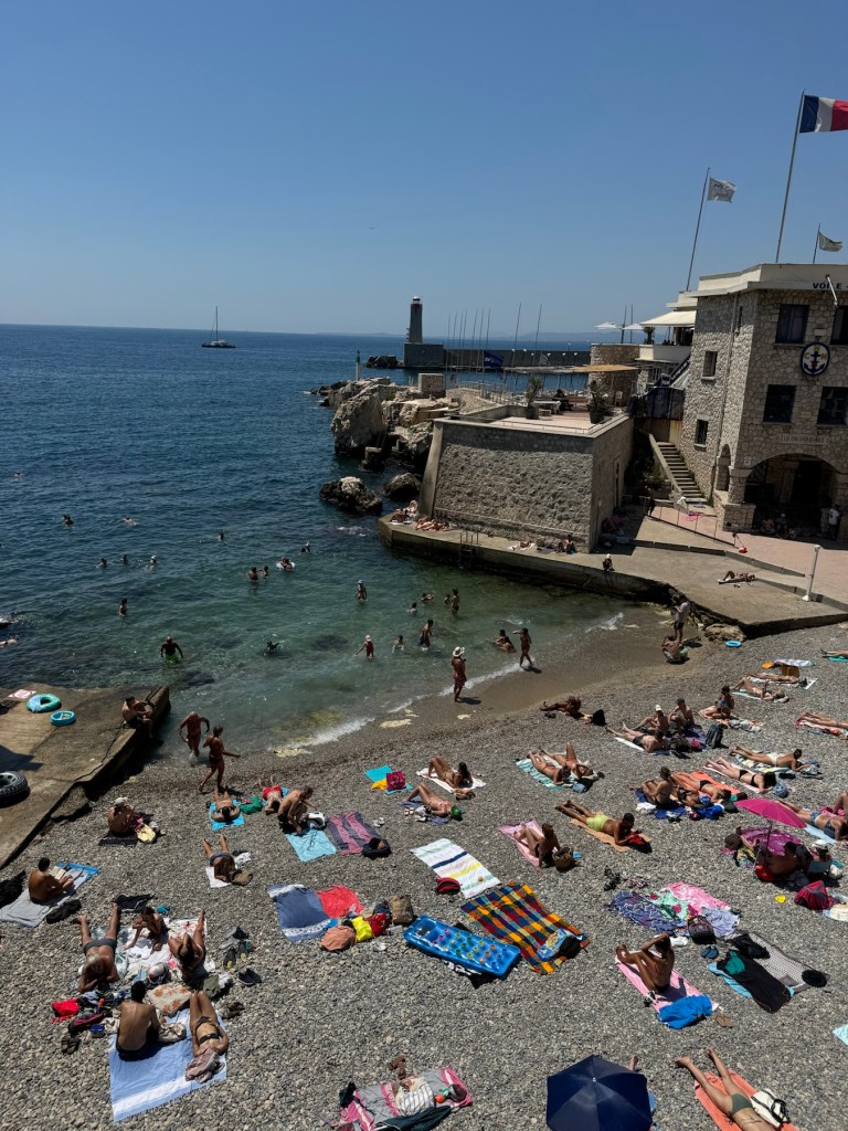 In the oppressive heat of the afternoon, the beaches were full, there were many people in the water and we grabbed seats with a view of the ocean, and watched the exciting end of the last climbing stage in this year’s Tour de France. C’est bon, all is good here, and Nice is Nice.