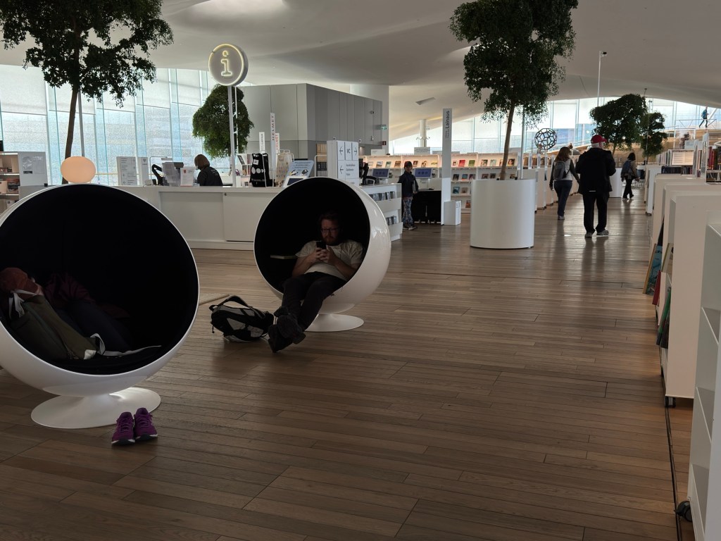 The library’s name was chosen through a contest, it translates to lyrical poem (ode). The second floor balcony of the library amazed me. It is essentially an urban workshop. There are 3D printers, vinyl cutters, electronic work stations, and sewing machines. There are VR glasses and gaming consoles. There also are rehearsal studios and instruments to use and meeting rooms and a test kitchen. The third floor has a children’s play area, books in 23 languages, actual trees to sit under and a balcony to admire the city. Finn’s encourage the use of libraries. It is the foundation for learning. It’s the latest it’s the greats it’s the library. Oodi is an ode to Finland and learning.